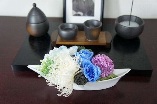お写真や仏具のじゃまにならないよう、高さをおさえました。正面からだけでなく上方から見ても美しいお供え花に仕上げました。